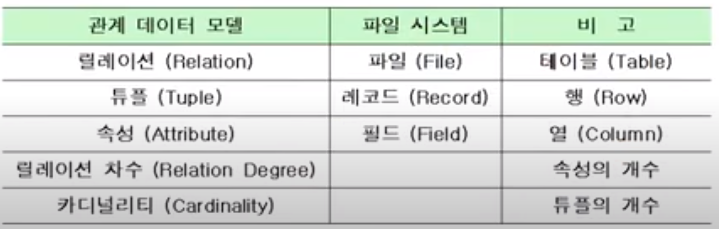 - 관계형 데이터베이스 용어에서 행은 튜플이라 하고, 열은 속성이라 하며, 릴레이션은 테이블이라고 한다.