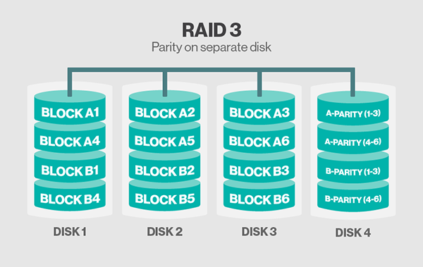 RAID 3은 데이터를 바이트 단위로 나누어 디스크에 동등하게 분산 기록하며 RAID 4는 데이터를 블록 단위로 나눠 기록하므로 약간의 차이는 존재한다.