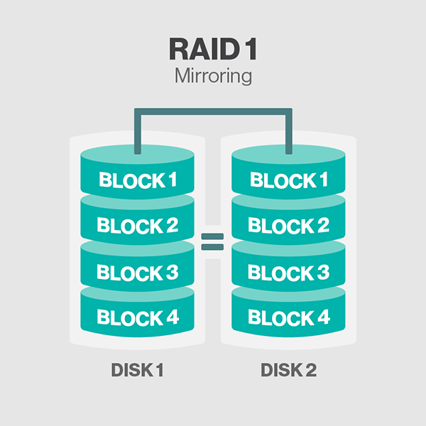 디스크 미러링이라고도 하는 이 구성은 데이터 저장소를 복제하는 두 개 이상의 드라이브로 구성된다. 스트라이핑 구성이 아니며 두 디스크를 동시에 읽을 수 있기 때문에 읽기 성능이 향상된다. 쓰기 성능은 단일 디스크에 쓰는 것과 같다.