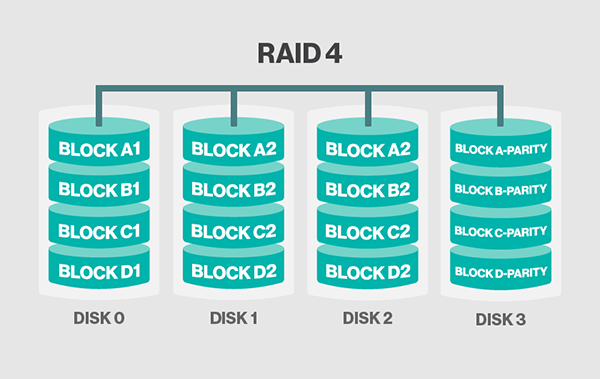RAID 4 구성은 RAID 3구성과 거의 동일하다고 보면되며 스트라이프를 사용하므로 단일 드라이브에서 데이터를 읽을 수 있다. 그리고 모든 쓰기 작업은 패리티 드라이브를 업데이트해야하지만 별도의 디스크이기 때문에 I/O 충돌이 발생하지 않는다.