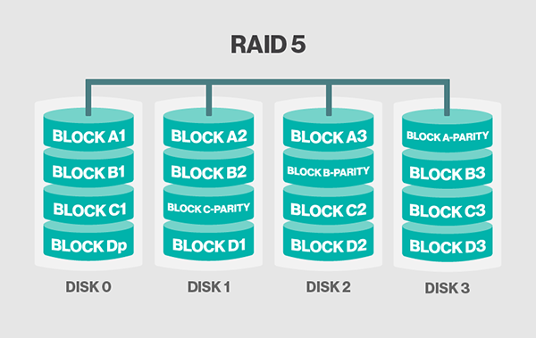 이 구성은 패리티가있는 블록 레벨 스트라이핑을 기반으로합니다. 패리티 정보는 각 디스크에 스트라이핑되므로 하나의 드라이브가 고장 나더라도 다른 어레이로 대체 작동 할 수 있다. 어레이 아키텍처는 읽기 및 쓰기 작업을 여러 드라이브로 확장이 가능하기 때문에 일반적으로 단일 드라이브의 성능보다 좋지만 RAID 0 어레이의 성능은 높지 않습니다. RAID 5는 3개 이상의 디스크가 필요하지만 성능상의 이유로 적어도 5 개의 디스크를 사용하는 것이 좋다고 한다.