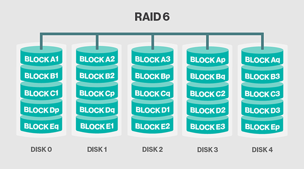 RAID 6은 RAID 5와 비슷한 구성이지만 다른 드라이브들 간에 분포되어 있는 2차 패리티 정보를 넣어 2개의 하드에 문제가 생겨도 복구할 수 있게 설계되었으므로 RAID 5보다 더욱 데이터의 안전성을 보장 할 수 있다. 하지만 이러한 추가적 보호 기능은 비용 부담으로 이어질 수 밖에 없다.