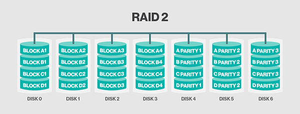 RAID2는 RAID 0처럼 스트라이핑 구성이지만 일부 디스크에는 오류 검사 및 수정을 위해 ECC(Error Correction Code) 정보가 저장된다. RAID 3~4에 비해 이점이 없으며 현재는 더 이상 사용되지 않는 구성이다.