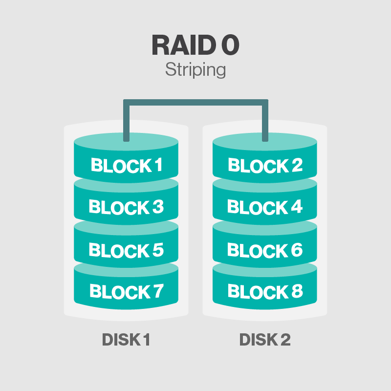 이 구성에는 스트라이핑이 있지만 데이터의 중복은 없습니다. 최상의 성능을 제공하지만 내결함성은 제공하지 않는다.