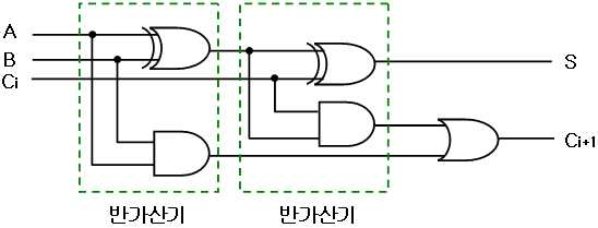 - 반 가산기의 회로에 뒷자리에서 발생한 자리 올림수를 처리할 수 있도록 한 회로