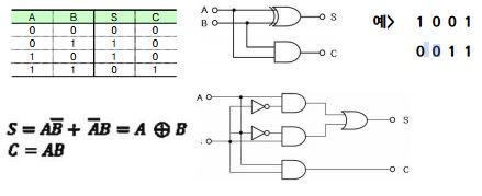 - 1bit짜리 2진수 2개를 가산한 합과 올림수를 구하는 조합 논리회로