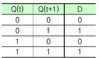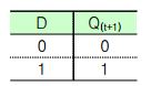 - RS FF의 R선에 인버터를 추가하여 S선과 하나로 묶어서 입력선을 하나만 구성한 플립플롭, 입력값이 그대로 저장하는 기능을 수행