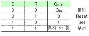 - S와 R선의 입력을 조절하여 임의의 Bit값을 그대로 유지시키거나 무조건 0 또는 1의 값을 기억시키기 위해서 사용되는 플립플롭