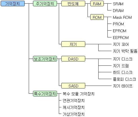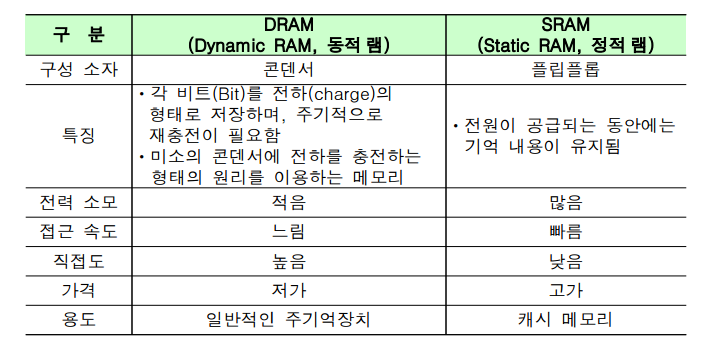 - RAM(Random Access Memory) - 실제 주기억장치로 사용이 되며 자유롭게 읽고 쓸 수 있는 기억장치