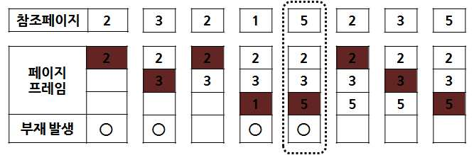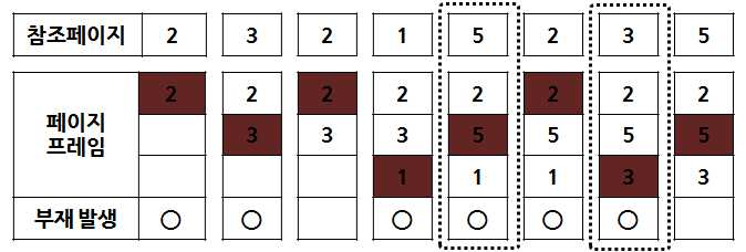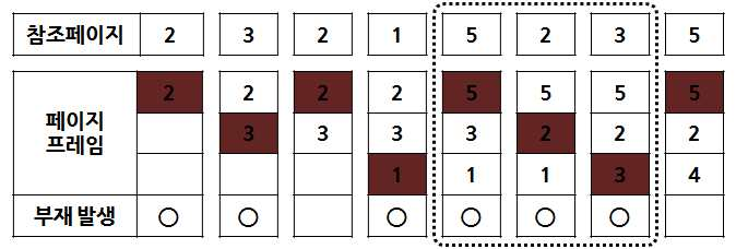 • LRU 기법 예 - 3개의 페이지 프레임을 가진 기억장치에서 페이지 부재 수는 5회