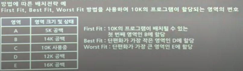 • 새로 반입되는 프로그램이나 데이터를 주기억장치의 어디에 위치시킬 것인지를 결정하는 전략