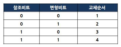 • 참조 비트와 변형 비트의 값에 따라 순서가 결정되고 페이지 교체