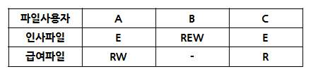- B는 인사파일 판독, 실행, 기록이 가능, 급여 파일은 접근 불가