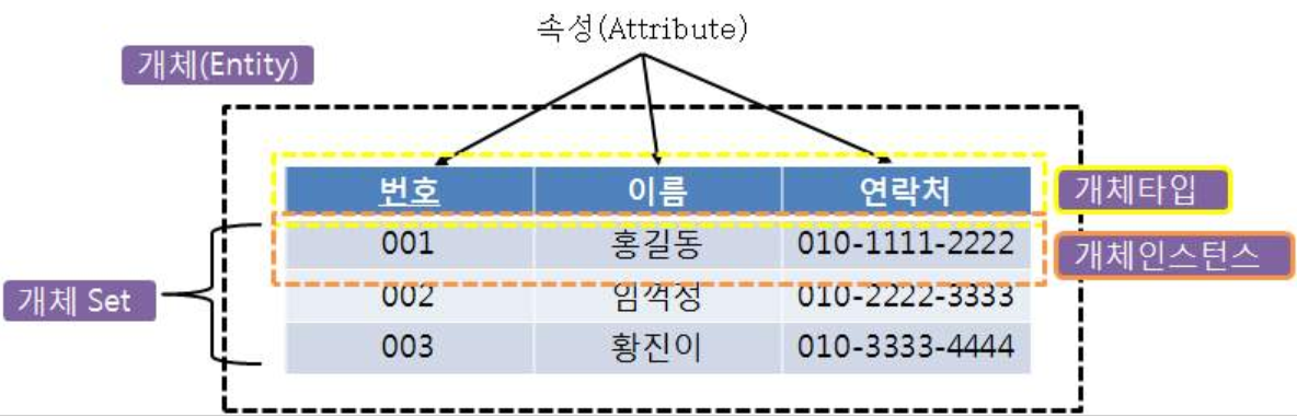 - 정보 구조를 구성하는 추상적 개념은 현실 세계의 객체에서 추상화된 개체(entity) 집합